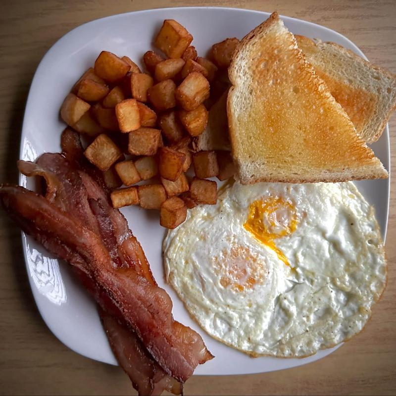 2 eggs your way with a choice of Bacon or Sausage Patty, hash browns, and toast.