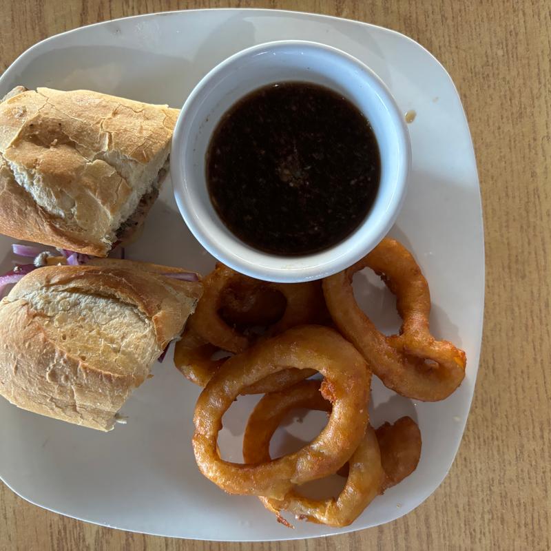 Smoked chicken and provolone cheese topped with bourbon glazed onions on a toasted hoagie roll served with au jus sauce.