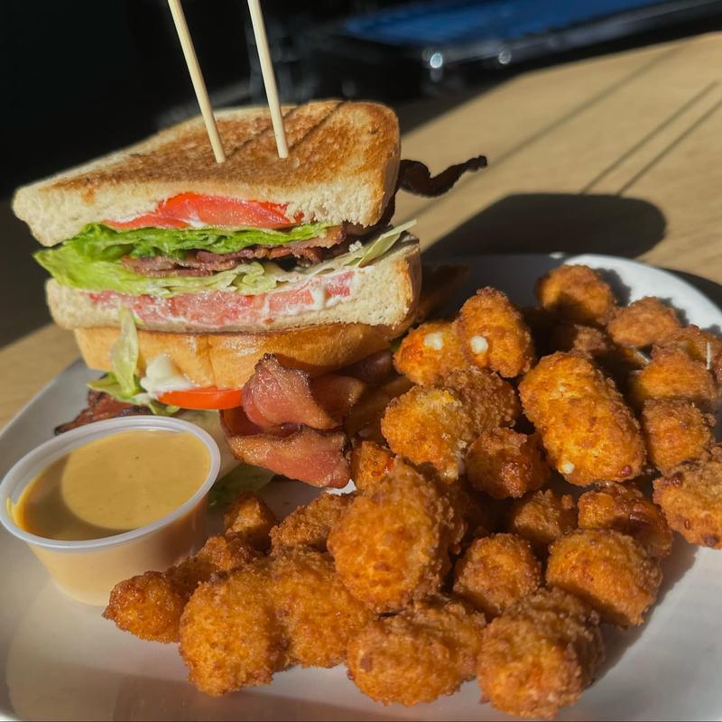 Bacon, lettuce, and tomato with mayo, on toasted buttermilk bread.
