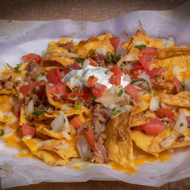 Tortilla chips topped with your choice of meat and sauces with onions, cheese, and olives.